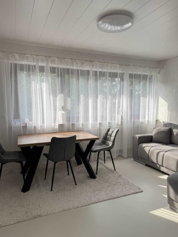 Die Wohnung überzeugt durch eine maßgeschneiderte Einbauküche, helle Räume und moderne Ausstattung. Das Wohnzimmer ist komplett eingerichtet mit Sofa, Esstisch und TV-Board, das Schlafzimmer verfügt über ein Bett und ausreichend Stauraum.