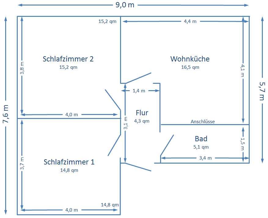 Die angebotene Wohnung ist die Dachgeschosswohnung in einem 3 Parteienhaus. Die Wohnung verfügt über 2 ca. 15qm große Schlaf/Wohnräume. Die gut 16qm große Wohnküche verfügt über eine etwa 3 Meter breite Küchenzeile. Das 5qm große Bad verfügt über Waschbecken, WC und Dusch/Badewanne. Alle Räume sind vom 4qm großen Flur aus erreichber.