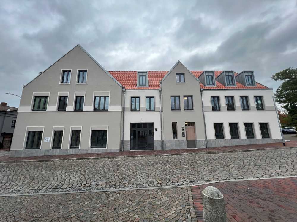 Das Niedrigenergiehaus verfügt über zwei Hauseingänge. In diesem Eingang, befinden sich nur drei Wohneinheiten und eine Gewerbeeinheit. Das Haus liegt direkt in der Innenstadt, sodass