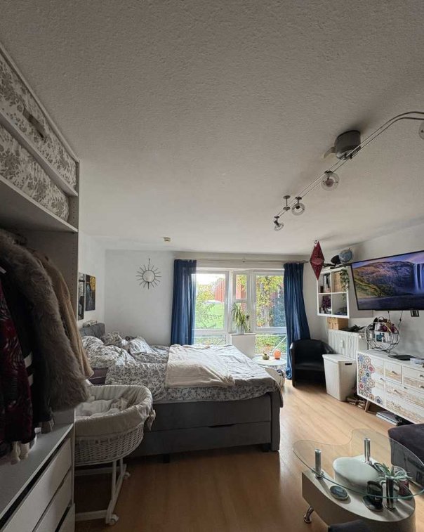 Das helle Wohn- und Schlafzimmer bietet vielfältige Gestaltungsmöglichkeiten und schafft mit seinem klaren Schnitt ein angenehmes Wohngefühl. Besonders hervorzuheben ist das neu sanierte Badezimmer, das mit modernen Armaturen und geschmackvollen Fliesen ausgestattet ist.