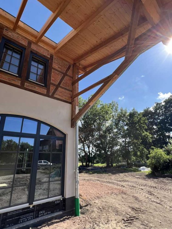 Die historische Hofscheune wurde 2025 vollständig neu zu modernen Wohnungen ausgebaut. Die Wärmeversorgung erfolgt über eine hofeigene Holzhackschnitzelheizung, der Strom über eine PV-Anlage (Mieterstrom). Trotz Endenergieklasse D hat das Gebäude einen sehr niedrigen Primärenergiebedarf von 25,1 kWh/(m²·a) – im beigefügten Energieausweis-Screenshot markiert.
