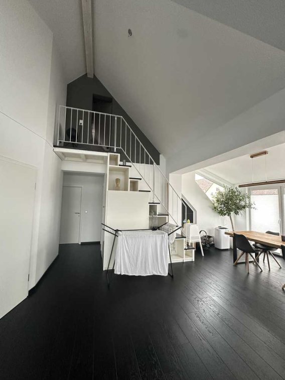 3 1/2-Zimmer-Wohnung im DG + Gäste-/Spielzimmer im DG 2 eines 4-Familienhauses, ca. 100 m² Wohnfläche, Balkon, gute Ausstattung, isolierverglaste Kunststoff-Fenster, Bodenbelag z. T. Laminat und z. T. Fliesen, Gas-Zentralheizung, Fußbodenheizung, elektrische Rollläden, Holzofen, Einbauküche, Bad mit Dusche und Badewanne, sep. WC, großer Balkon, Keller, Stellplatz im Carport.