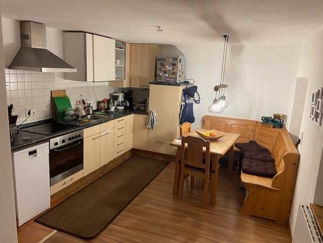Das helle Wohnzimmer und die Wohnküche mit Holzofen (Küchenherd) schaffen eine warme, einladende Atmosphäre.