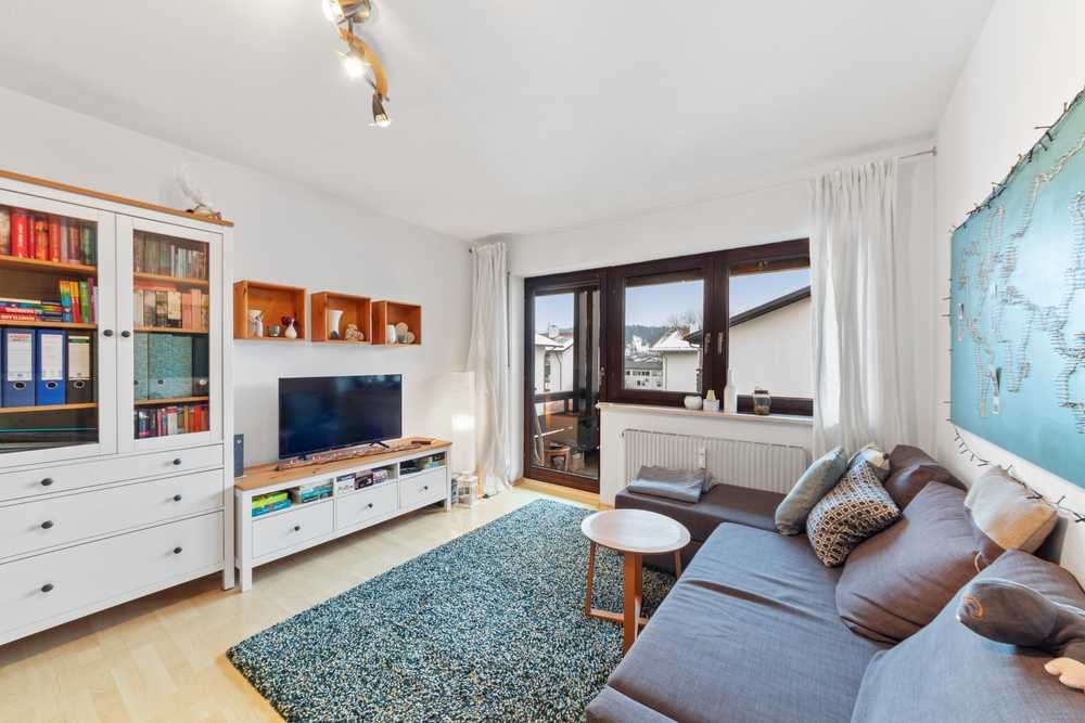 Das Wohnzimmer öffnet sich zu einem großzügigen Westbalkon, ein idealer Ort um die Abendsonne und die Ruhe der Umgebung zu genießen. Dank der Rollläden lässt sich die Wohnung leicht abdunkeln und bietet zusätzlichen Schutz und Privatsphäre.