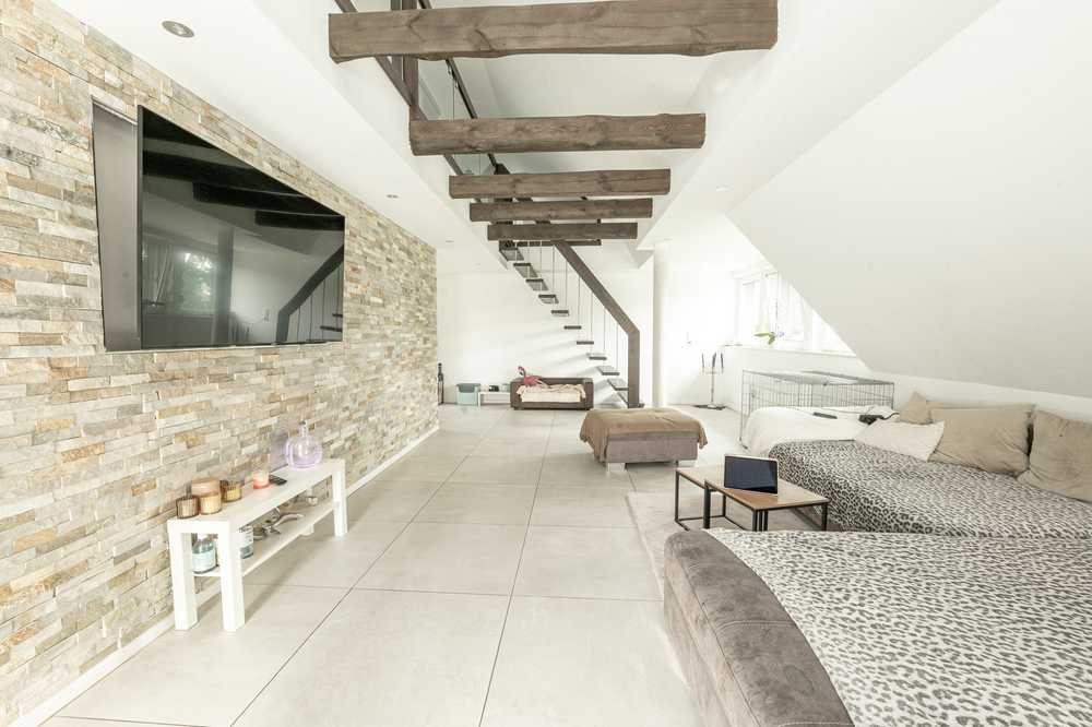 Ein stilvolles Badezimmer mit Dusche und Badewanne sowie ein weiteres flexibel nutzbares Zimmer ergänzen das Raumangebot dieser Ebene. Über eine offene Treppe gelangt man auf die Galerie, wo sich ein großes Zimmer befindet, das derzeit als Schlafzimmer genutzt wird. Ein kleines Duschbad sorgt auch hier für zusätzlichen Komfort.
