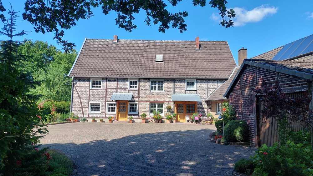 Fachwerkhaushälfte auf dem Lande mit unverbautem Blick ins Grüne