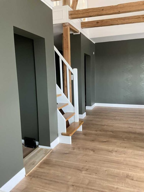 Auf 84 m² Wohnfläche entfaltet sich ein modernes Zuhause mit sichtbaren Holzbalken, offener Galerie, stilvollen Böden und edlem Farbkonzept.