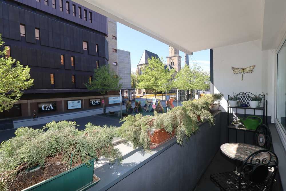 Genießen Sie Ihre Auszeit auf dem eigenen Balkon mit Blick auf die belebte Innenstadt und die historische Kirche – urbanes Flair inklusive.