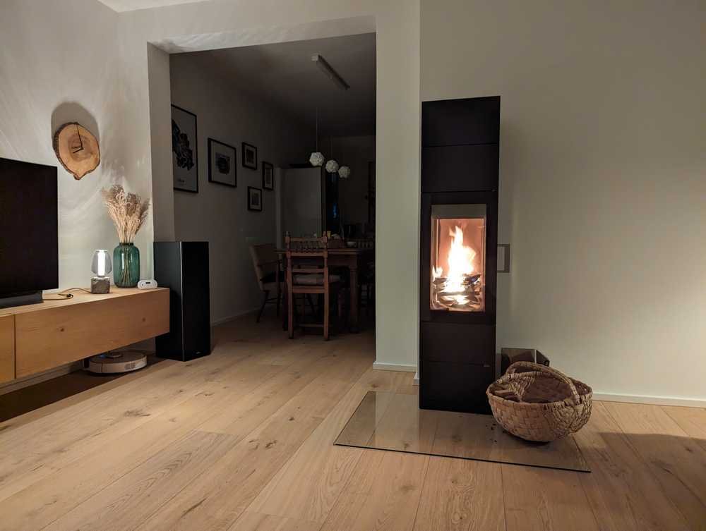 Das Haus verfügt im EG über eine offene Küche und Wohnzimmer mit Kamin, im 1. OG ein Arbeitszimmer und ein Schlafzimmer inkl. Garderobe und en Suite Badezimmer. Im 2. OG befindet sich ein offenes Studio.