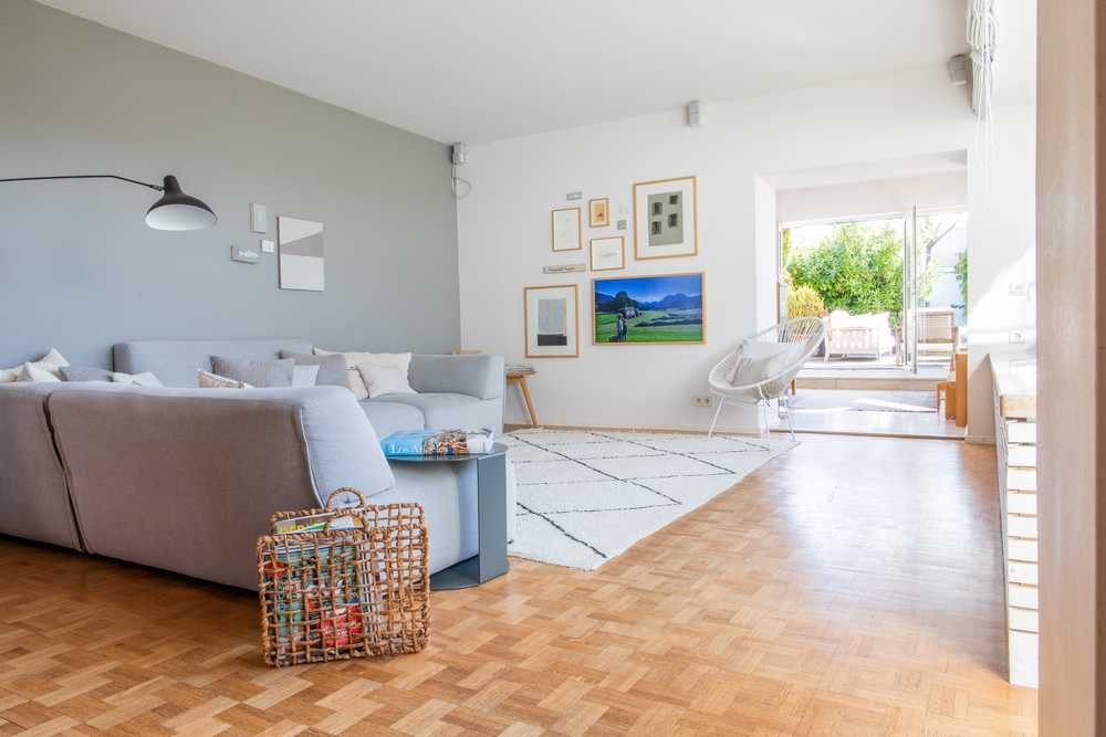 Die 120 m² große Südterrasse mit Lounge, großem Esstisch, Sandkasten und zwei Teak-Sonnenschirmen der Marke Weishäupl ist eine grüne Oase mitten in der Stadt. Für kulinarische Abende steht ein Weber-Gasgrill mit Sear Station bereit – perfekt für entspannte Sommernächte. Vom Balkon auf der 7. Etage öffnet sich der Blick bis in die Alpen.