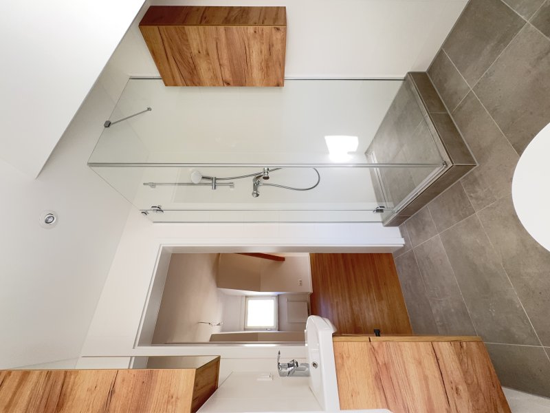 Das Badezimmer ist modern ausgestattet und verfügt über eine Dusche.