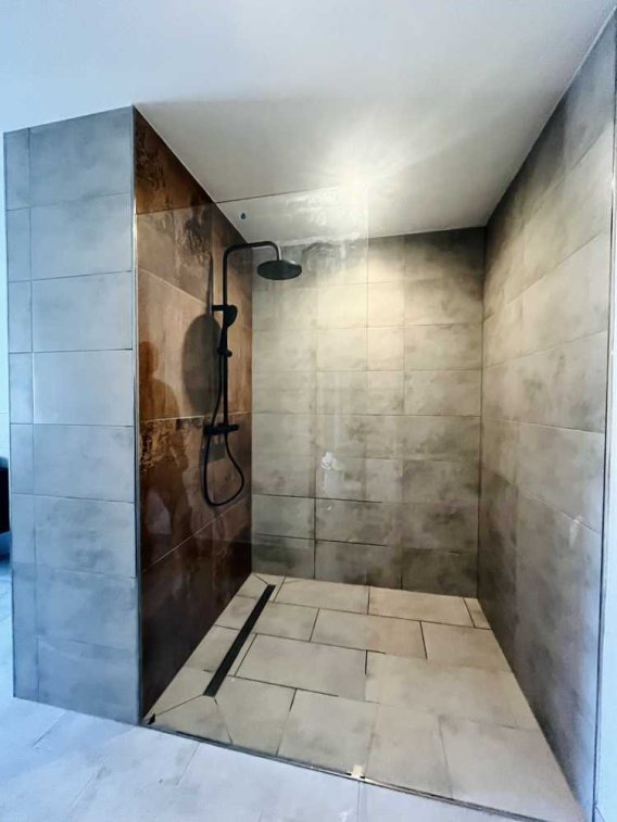 - Edles Hauptbadezimmer (ca. 17 m²) mit bodengleicher großer Dusche, Wanne, Design-Waschtisch und modernen Fliesen