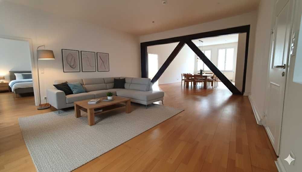 Die 3-Zimmer-Wohnung, bestehend aus einem großen, hellen Wohn-Esszimmer, zwei geräumigen Schlafzimmern, einer Küche und einem Bad mit separatem WC, vereint modernen Wohnkomfort mit fachwerktypischen Elementen. Die frei liegenden Balken im Wohnbereich schaffen in Verbindung mit dem Parkettboden eine gemütliche Atmosphäre und verleihen der Wohnung einen einzigartigen Charakter. Durch die vielen und großen Fenster der Wohnung gelangt sehr viel Tageslicht in die Zimmer.
