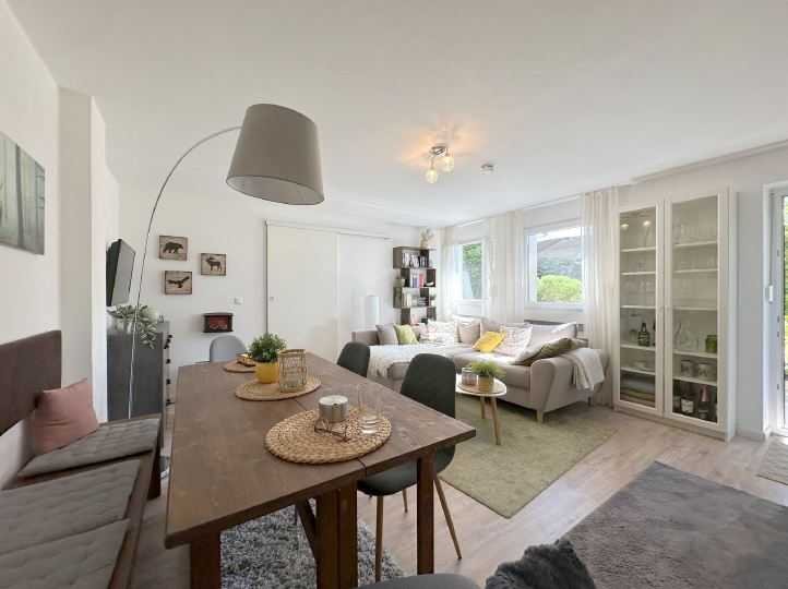 Spazierwege führen zum Froschhausersee und Riegsee. Die Wohnung wurde in 2017 hochwertig renoviert und ist voll ausgestattet mit Möbeln und einer Einbauküche, so dass sie direkt bezogen werden kann. Lediglich ein Bett ist noch nicht vorhanden. Der Schlafbereich ist durch eine Schiebetür vom Wohn- und Esszimmer getrennt. Auf der sonnigen 17 qm großen Terrasse sind hochwertige Holz-Gartenmöbel und eine Markise installiert. Die Terrasse wurde zusätzlich gerade umgestaltet und erweitert.