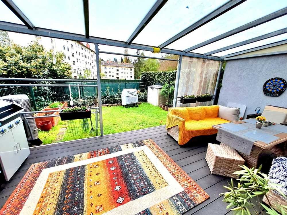Im Erdgeschoss erwartet Sie ein großzügiger, offener Wohn- und Essbereich mit integrierter Einbauküche und drei großen Fenstern zur sonnigen Terrasse. Von hier aus gelangen Sie direkt in den kleinen, pflegeleichten Garten – eine grüne Oase mitten in der Stadt.