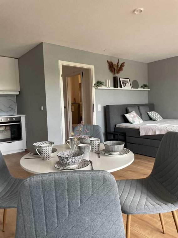 Wohnambiente, sondern auch einen herrlichen Balkon mit Weitblick. Den 5. Stock erreichen Sie bequem über einen Personenaufzug. Die Wohnung ist mit einer neuen Küche inkl. Induktionsherdplatte und Spülmaschine ausgestattet, das kernsanierte Bad besticht im edlen grau, die große Dusche lässt keine Wünsche offen. Schlafen werden Sie in einem 1,80 x 2,00 m großen Boxspringbett. Eine ausziehbare Couch sowie ein Esstisch mit 4 Stühlen runden das nagelneue Mobiliar ab. Liebevoll gestaltet finden Sie hier alles was Sie brauchen, vom Teller bis zum Kleiderbügel. Ideal für Geschäftsreisende, die etwas länger in Kempten sind.