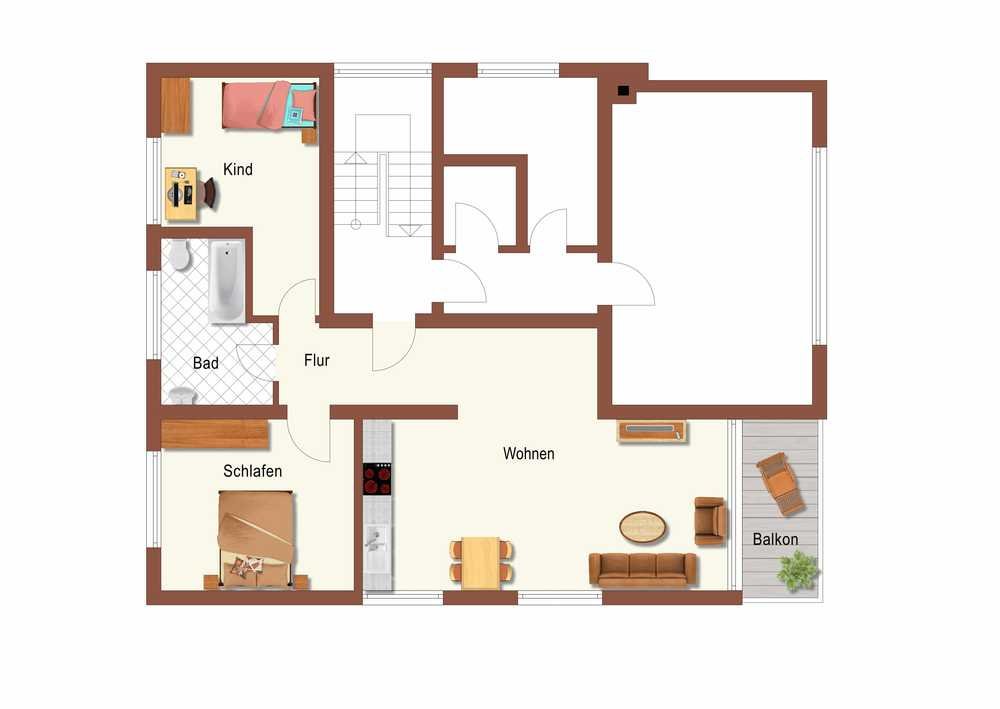 Die großzügige Wohnung bietet ein Wohn-/Esszimmer mit offener Küche, 2 Schlafzimmer, sowie ein Tageslichtbad (mit großzügiger Walk-in-Dusche/WC). Zu der Wohnung gehört ferner ein Kellerraum sowie die Mitbenutzung der Waschküche.