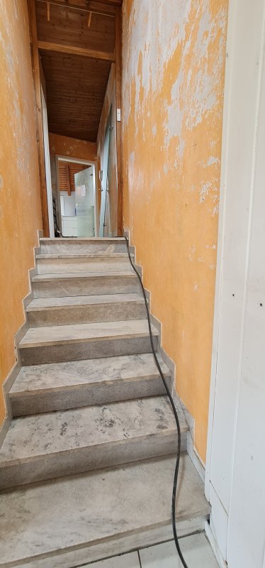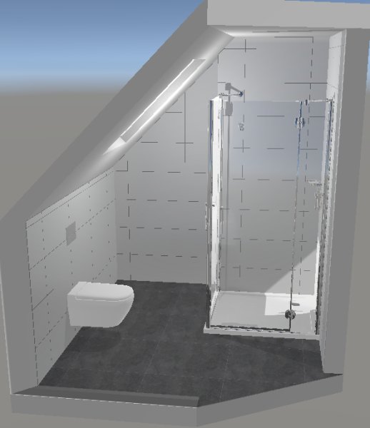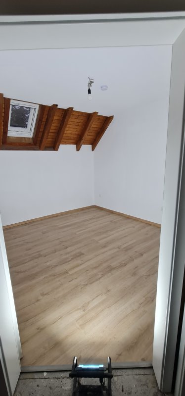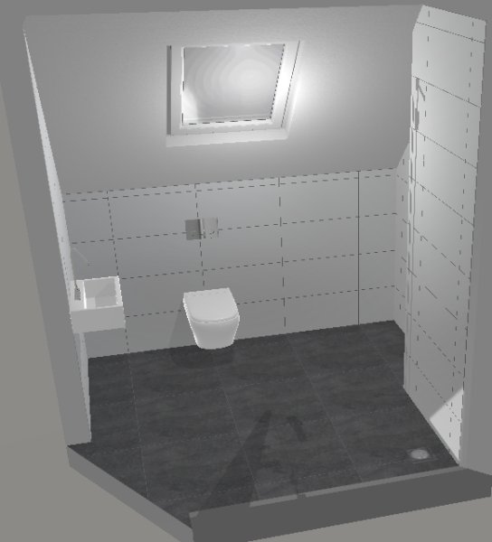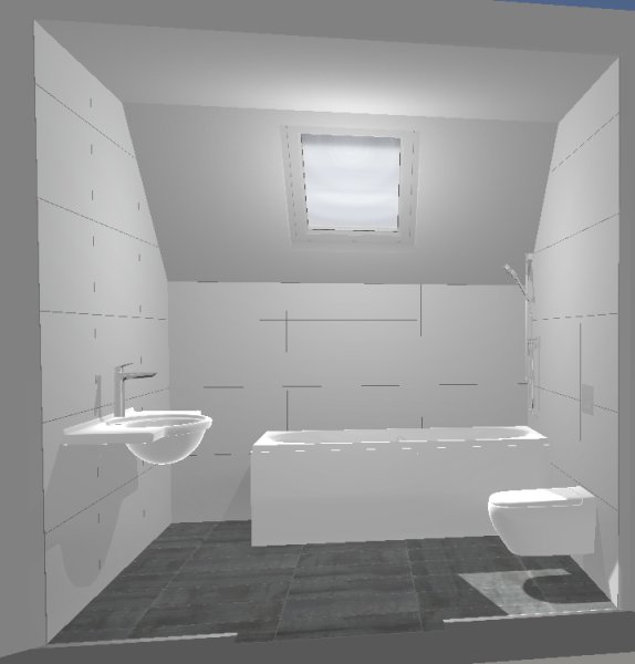 Alle Zimmer wurden Weis gestrichen und mit neuem Laminatboden versehen. Die Flure bekommen noch die gleiche Behandlung, sobald die beiden Tageslichtbäder fertig saniert wurden. Hier wird noch neu gefliest ( siehe Simulationsfoto) mit Schwarzen Fliesen für den Boden und weise für die Wände. Das untere Bad wird mit einer Badewanne mit Duschfunktion ausgestattet, während das obere Bad eine Dusche bieteten wird.