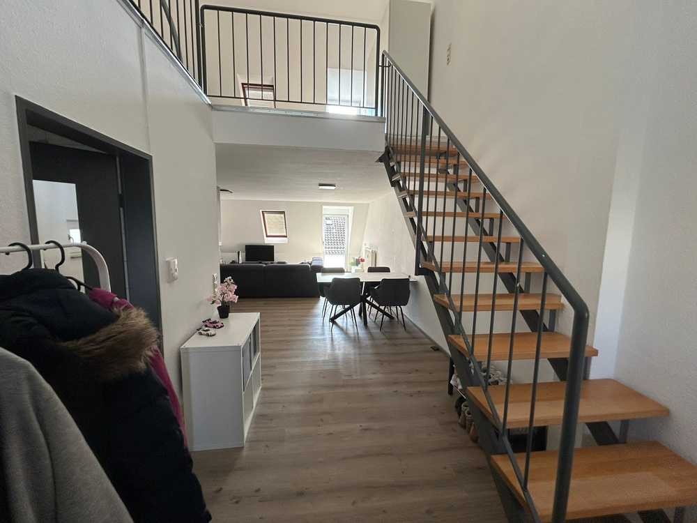 Der Wohn- Essbereich ist mit einem Vinylboden und einer Einbauküche (ohne Kühlschrank) ausgestattet. Im Bereich der Einbauküche befinden sind Bodenfliesen. Der ausgebaute Dachspitz ist über eine gerade Innentreppe erreichbar und ist ebenfalls mit Vinyl ausgestattet.