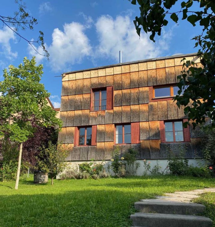 Das Gebäude aus Naturbimsstein wurde 2010 mit Massivholz von außen gedämmt und mit Holzplatten verkleidet. Diese nachträgliche Art der Dämmung funktioniert gut und wirkt sich auch sehr gut auf das Raumklima aus, eine solche Dämmung ist in den Berechnungsmodulen für die Erstellung eines Energieausweises nicht bekannt und deshalb darin nicht berücksichtigt. Dies bedeutet, dass die Dämmung in Wirklichkeit erheblich besser ist. Das ebenfalls 2010 aus Massivholz gebaute und komplett stützenfreie Dachgeschoß mit Massivholzdach und experimenteller Dachhaut bringt ein sehr gutes Raumklima.