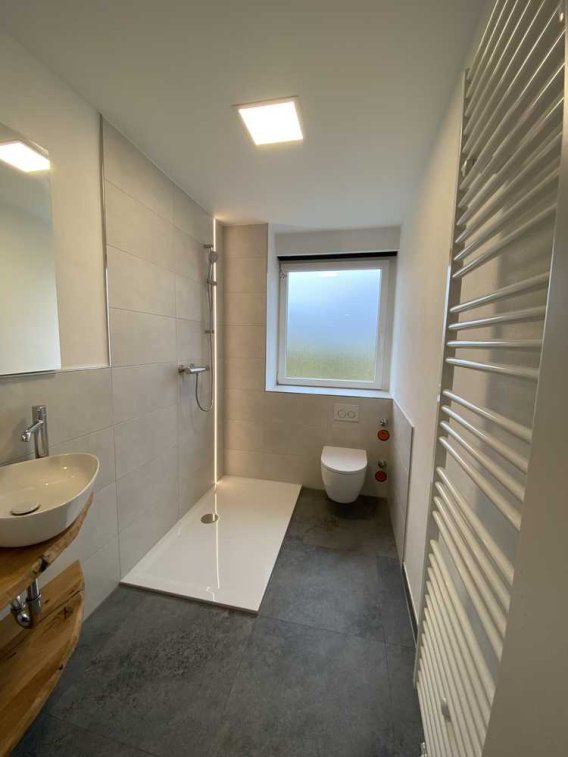 Die Duschwand für die Walk-In-Dusche sowie die Glastür ins Wohnzimmer werden in Kürze noch angebracht.
