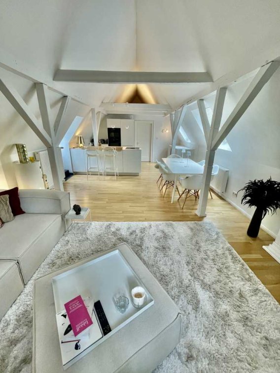 Die Wohnung erstreckt sich über zwei Etagen mit ca. 83m² Wohnfläche (bedingt durch Dachschrägen) und wurde mit hochwertigen Materialien und Designerstücken ausgestattet. Die Straßenbahnhaltestelle (Linie 4) ist fußläufig erreichbar, kostenlose Parkplätze befinden sich direkt vor dem Haus.