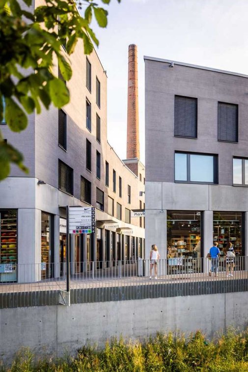 Hier wurde das Outlet-Shopping-Angebot erweitert. In den oberen Geschossen ergänzen Wohnen, Büros und Praxen das Ensemble. Ein moderner Gastronomie-Betrieb rundet das Angebot ab.