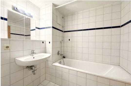 • Innenliegendes Badezimmer hell gefliest mit Badewanne, Waschbecken, WC und Waschmaschinenanschluss