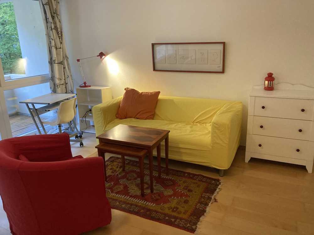 Helles, geräumiges Zimmer, unterteilt in Kochen/Essen, Wohnen, Arbeiten, Schlafen. Komplett ausgestattete Küche, inkl. Cerankochfeld, leise Kühl- & Gefrierkombi, Spülmaschine. Badezimmer mit Badewanne und Waschmaschine.