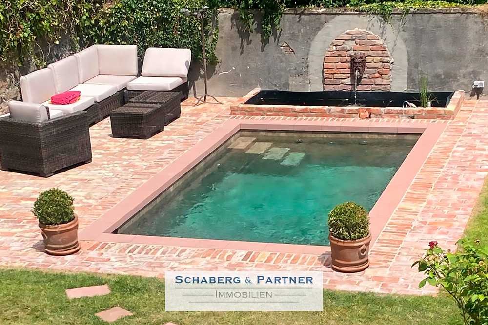 Die aufwendig gestaltete Gartenanlage ist eine Oase der Ruhe und Privatsphäre. Mediterrane Pflanzen, dezente Gartenbeleuchtung, automatische Bewässerung und Natursteinwege umrahmen den im Jahr 2022 errichteten Outdoor-Pool mit Gegenstromanlage. Ein angrenzender Lounge-Bereich bietet ein stilvolles Ambiente für laue Sommerabende oder repräsentative Empfänge im Freien.