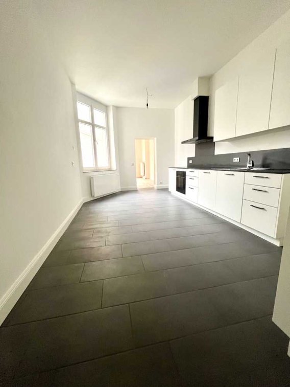 Der Flur, das Schlafzimmer, das Wohn-Esszimmer und die Wohnküche wurden mit hochwertigem Echtholzparkett in Dielenoptik sowie weißen Holzfußleisten ausgestattet. Der hohen Decken unterstreichen den Altbaucharakter der Immobilie. Die neue maßgefertigte Einbauküche lässt keine Wünsche offen.