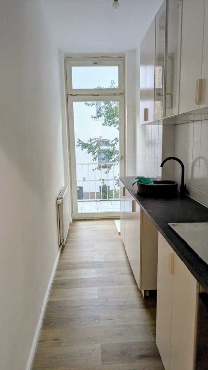 Die Wohnung verfügt über eine kernsaniertes funktionales Bad sowie eine kleine neu eingebaute Küche, die mit einem Geschirrspüler sowie einem Kühlschrank und einem Induktionskochfeld ausgestattet ist. Außerdem bietet die Küche Platz für eine Waschmaschine.