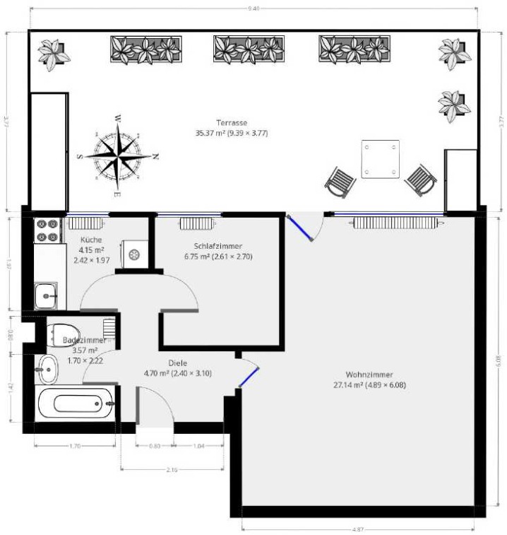 Die traumhafte Terrasse ist Richtung Westen ausgerichtet. Sie hat mit ca. 35 m2 viel Platz für Pflanzen, Sonnenliege, Tisch und Grill. Ein großer Terrassen-Außenschrank bietet viel Stauraum. Ein Gartentisch wird von den Vormietern kostenlos überlassen. Die Gartenstühle können gern übernommen werden.