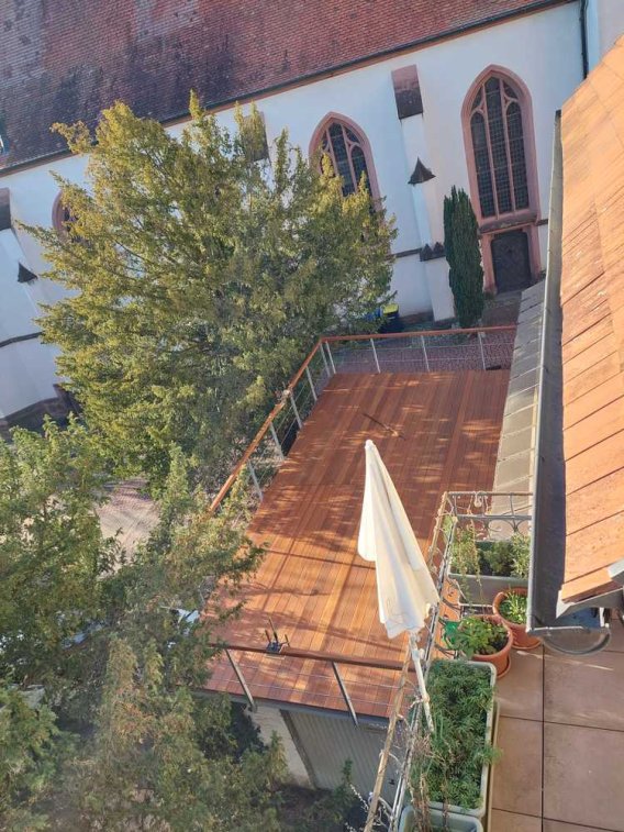 Auf der neu sanierten Terrasse sind massive Echtholzdielen verlegt.