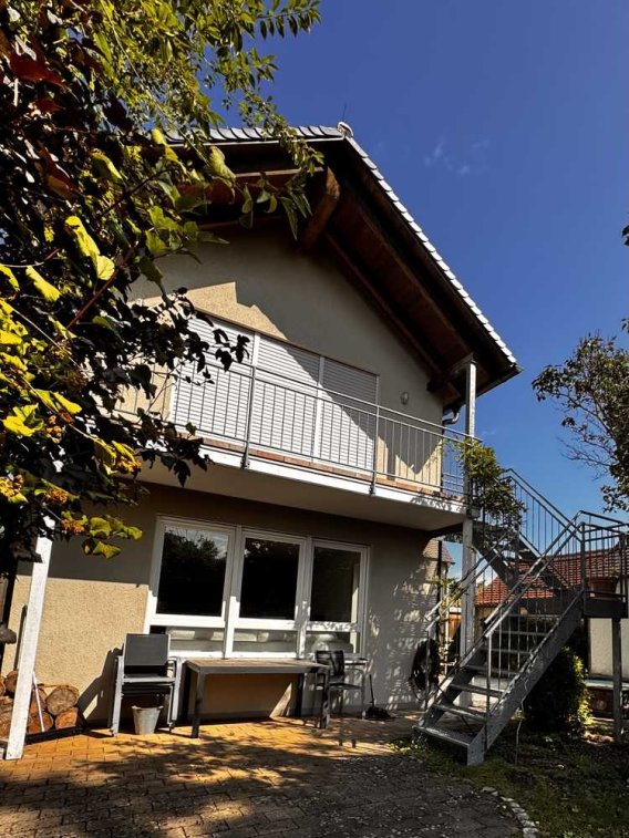 Im ersten Obergeschoss befinden sich drei Schlafzimmer, sowie ein Durchgangszimmer/Atelier, welches beispielsweise als Arbeitszimmer genutzt werden kann. Das größte dieser Zimmer ist galerieartig aufgebaut und verfügt über einen Balkon, über welchen man mittels Außentreppe einen direkten Gartenzugang erhält.