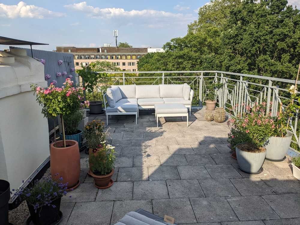 Absolutes Highlight der Wohnung ist die dazugehörigen ca. 30 m2 große Dachterasse nach hinten zum Garten raus, auf der man im Sommer bis spät Abends Sonne hat.