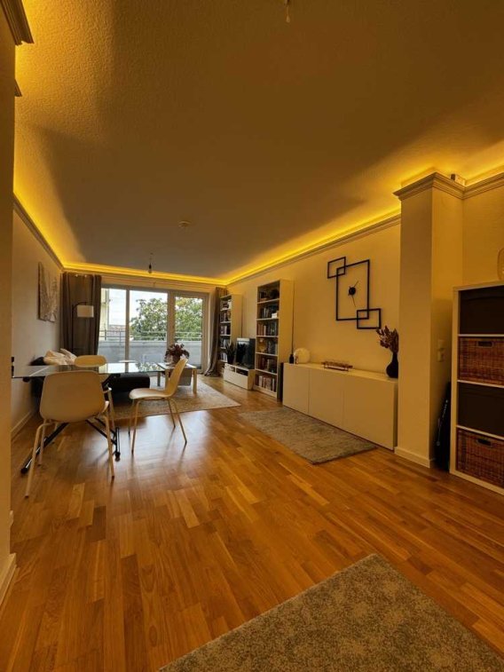 Beim Betreten der Wohnung gelangen Sie in einen Flur, von dem aus alle Räume zugänglich sind. Der Wohn- und Essbereich bietet ausreichend Platz für individuelle Einrichtungsmöglichkeiten und zeichnet sich durch den hochwertigen Parkettboden und die stimmungsvolle Beleuchtung aus. Große Fensterfronten sorgen für eine angenehme Helligkeit und einen freundlichen Raumeindruck.