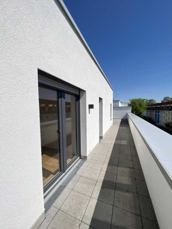 Über die große Fensterfront im Wohnbereich gelangen Sie auf die atemberaubende und riesige Dachterrasse. Egal ob ruhige Liegeecke oder der große Esstisch für Freunde und Familie – hier können Sie sich verwirklichen.