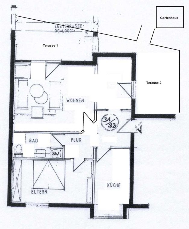 Besonders hervorzuheben ist, dass die Wohnung über zwei miteinander verbundene Terassen verfügt. Somit kann man von morgens bis abends die Sonne geniessen. Vor der prallen Mittagssonne schützt Sie eine Markise, die am Haus befestigt ist. Der gepflegte Garten mit dem Gartenhäuschen "Villa Hügel" sowie einem kleinen Springbrunnen gehört ebenso zur Wohnung dazu.