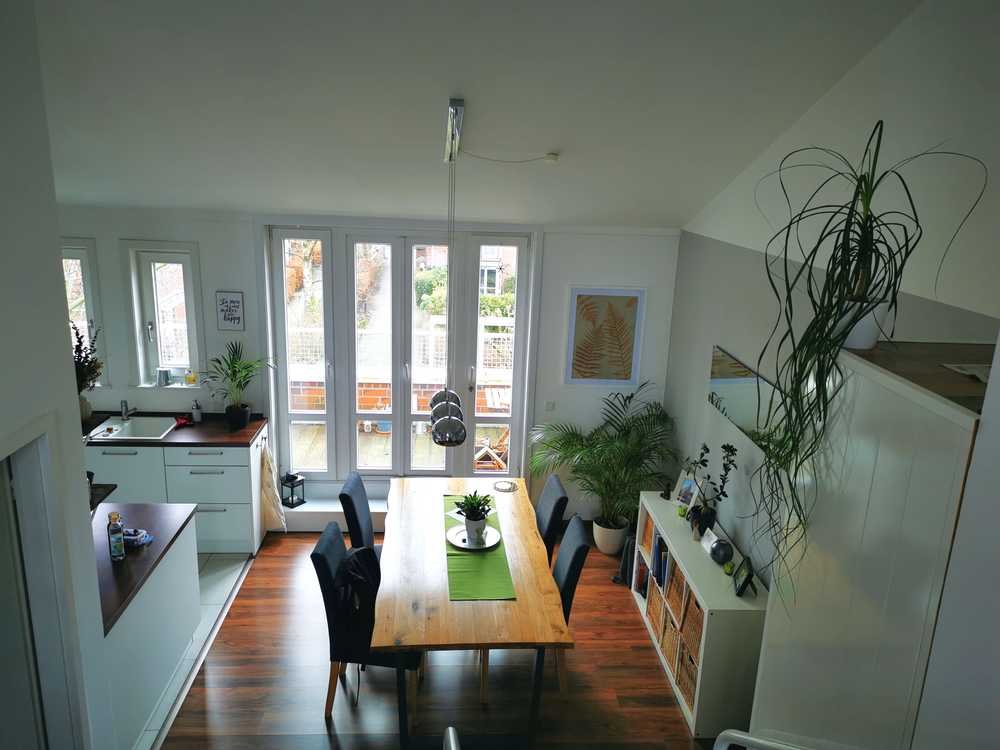 Diese charmante Maisonettewohnung erstreckt sich über drei Ebenen und überzeugt durch ihre lichtdurchfluteten Räume dank nahezu bodentiefer Fenster auf allen Etagen.