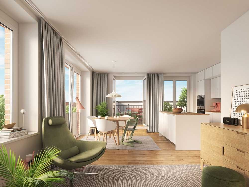 Die großzügig gestalteten Außenanlagen, entworfen von den renommierten nsp Landschaftsarchitekten, bieten Ihnen Raum für Erholung und Begegnung. Betonsitzblöcke, Spielplätze und Sitzbänke laden zum Verweilen und zum Austausch mit Nachbarn ein – ein Quartier, in dem Sie sich von Anfang an zuhause fühlen.