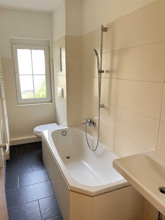 Das sanierte Badezimmer mit Badewanne und Fenster überzeugt durch seine funktionale Eleganz und sorgt für eine angenehme, helle Raumwirkung. Die Wohnung besticht durch ihre durchdachte Grundrisseinteilung und die hochwertige handwerkliche Ausführung aller Sanierungsarbeiten.