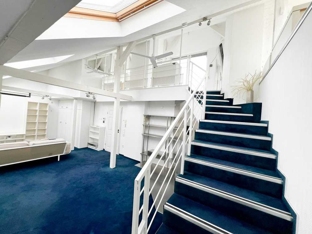 Sie verfügt über ein großzügiges Wohnzimmer im 4. OG, wahlweise teilmöbliert (s. Fotos). Über eine elegante Treppe gelangt man zur Galerie im 5. OG. Dort befinden sich auch das Tageslicht-Badezimmer mit Dusche sowie die Einbauküche mit Markengeräten, die gegen 1.000 EUR Ablöse übernehmbar ist.