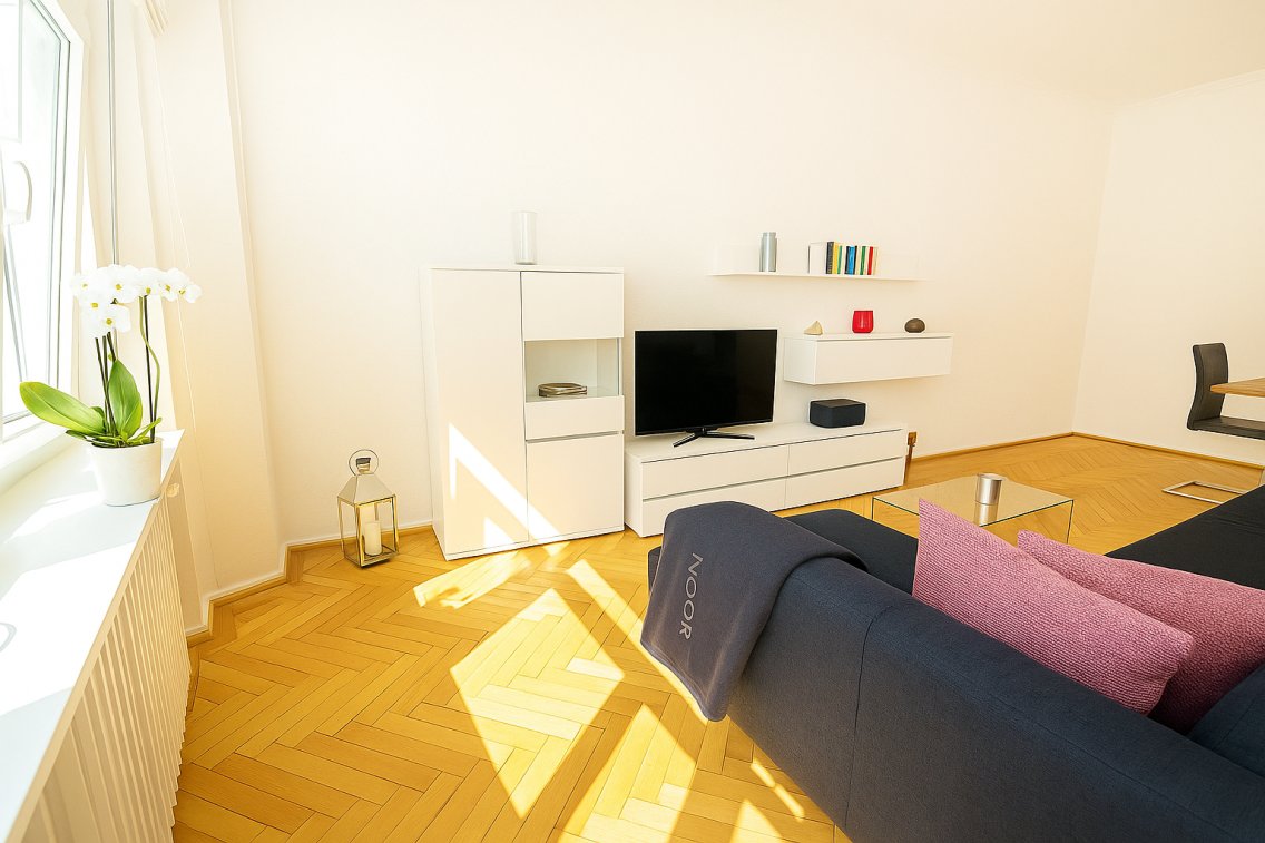Hochwertig möblierte 2 Zimmer Wohnung in Düsseldorf Düsseltal zu vermieten Die Wohnung befindet sich im 2 Obergeschoss eines gepflegten Mehrparteienhauses in der Lindemannstraße 10 und bietet rund 74 m² Wohnfläche Sie ist modern ausgestattet und vollständig möbliert Das Wohnzimmer verfügt über eine elegante Eckcouch die auch als Schlafsofa genutzt werden kann einen großen Esstisch mit Stühlen eine Wohnwand mit Glasvitrine Kabel TV und edlen Parkettboden Die separate weiße Hochglanzküche mit Granitplatte ist mit Induktionsfeld Backofen Kühl Gefrierkombination Spülmaschine Kaffeemaschine Mikrowelle und Waschmaschine mit integriertem Trockner ausgestattet Das Schlafzimmer bietet ein Doppelbett 160 x 200 cm und zwei Kleiderschränke Das Bad verfügt über eine bodengleiche Dusche Rainshower Dornbracht Armaturen und Dusch WC Eine große Dachterrasse mit Sitzmöbeln Sonnenliegen und Dusche steht zur gemeinschaftlichen Nutzung bereit Einkaufsmöglichkeiten Restaurants und der Zoopark sind fußläufig erreichbar.