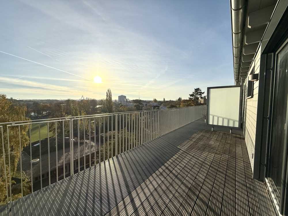 Die Wohnung verfügt über eine eindrucksvolle Panorama Sonnenterrasse. Von hier aus bietet sich ein besonders schöner und beeindruckender Weitblick. Ein Gefühl wie Schweben über der Stadt. Hier genießen Sie Sonne pur.