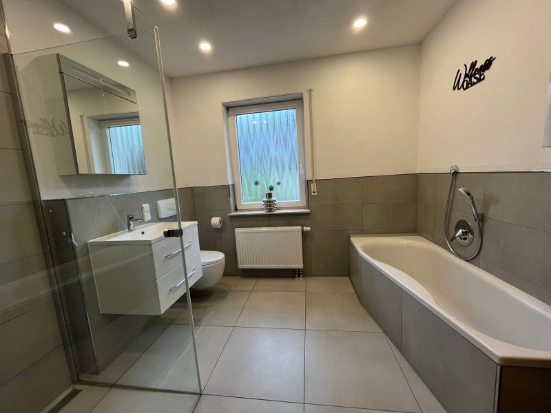 Das Badezimmer besteht aus einer ebenerdigen Dusche, einer Badewanne, Waschbecken mit Spiegelschrank und WC.