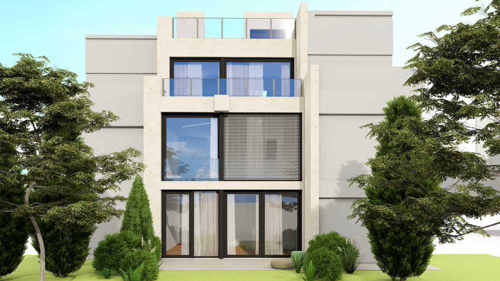 Das Haus erstreckt sich über mehrere Halbetagen: Oben eine Dachterrasse, darunter der Master-Bereich mit Bad, ein großzügiges Wohnzimmer mit Balkon, ein Arbeits-/Loungezimmer, ein großer Küchenbereich (Küche individuell gestaltbar), und unten ein weiteres großes Zimmer mit eigenem Bad, flexibel nutzbar, zum Beispiel für Kinder.