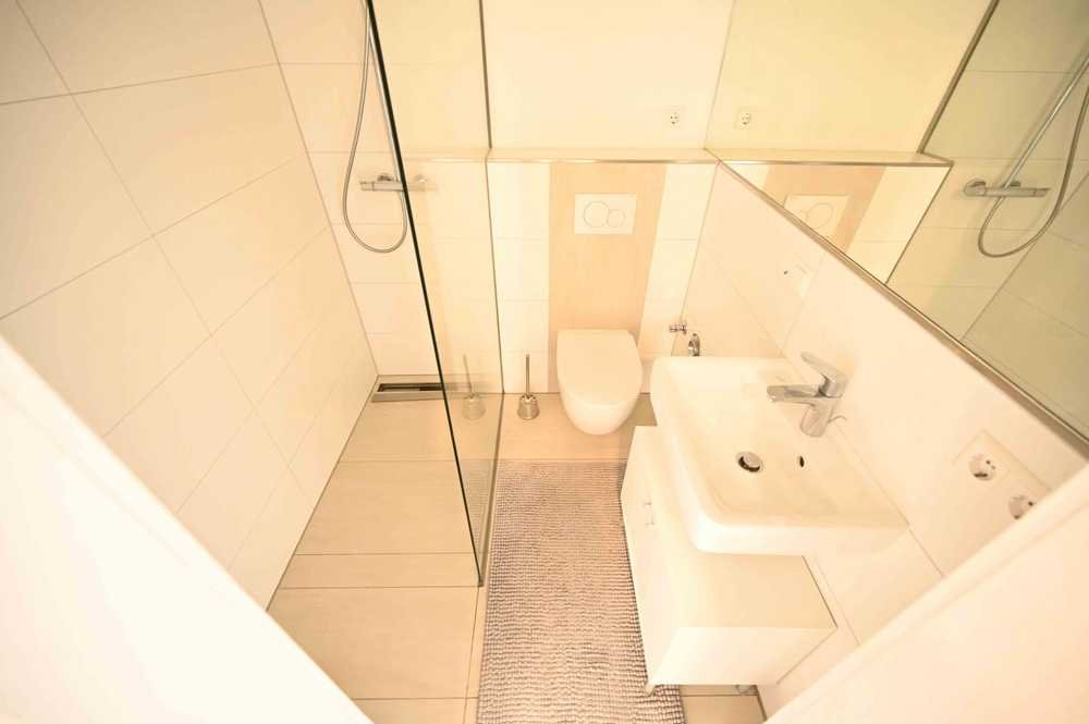 Das Bad hat eine Glasduschabtrennung (Walk In) mit Kopfbrause und Handdusche, sowie ein modernes spülrandloses WC. Die gesamte Wand über dem Waschtisch ist verspiegelt.