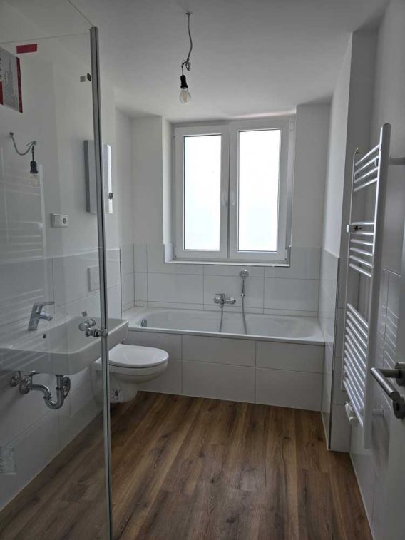 Ein echtes Highlight ist das nagelneue Badezimmer: Es ist modern gefliest und mit einer Badewanne, einer separaten Dusche, einem Hänge-WC und einem Handtuchheizkörper ausgestattet – ein Raum zum Wohlfühlen und Entspannen.