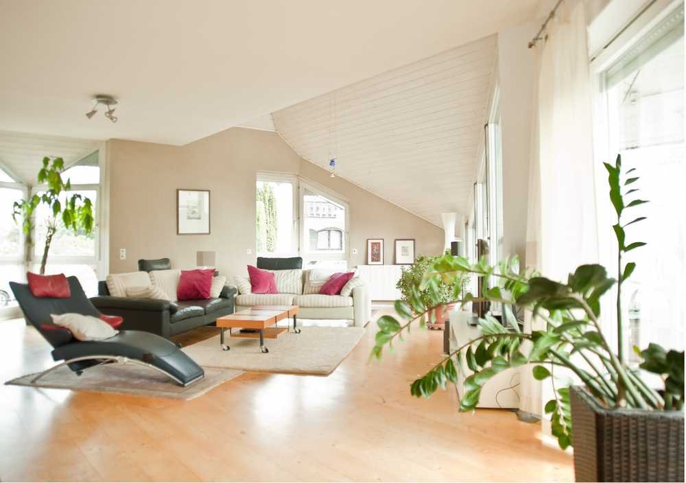 Das Herzstück des Hauses bildet der großzügige Wohn- und Essbereich. Hier sorgen weiß lasierte Holzdecken, helle Parkettböden und große Fensterfronten für ein angenehmes Raumgefühl und viel Tageslicht. Der stilvolle Kachelofen setzt einen gemütlichen Akzent und macht den Raum besonders in den Wintermonaten zum Wohlfühlort. Der fließende Übergang von Wohnzimmer, Essbereich und der hochwertigen Bulthaup-Küche schafft Offenheit und Lebendigkeit – ideal für gemeinsame Stunden mit Familie und Freunden.